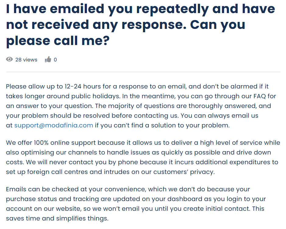 It is unlikely that this is merely a technical glitch, especially for a company claiming to live up a vendor standard. This months-long issue fits the pattern of an “exit scam”—a fraudulent practice where a business continues to accept payments while effectively abandoning operations, especially because their website remains open to new orders despite widespread complaints and unanswered inquiries. Modafinia even addresses this issue in their own site’s FAQ, but instead of offering a solution, they pre-emptively defend their non-responsiveness. They insist on email-only support, discourage real-time communication with cost and privacy excuses, and place the burden of communication on the customer. Taken together, the FAQ reads less like an explanation and more like an attempt to deflect legitimate concerns rather than resolve them.