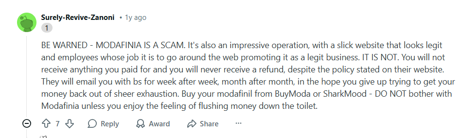 The supposed connection to HighStreetPharma wasn’t ignored either. TalkNootropics pointed out that both vendors appeared around the same time and now show the same pattern of problems: inflated good reviews, missing orders, and customer service that simply disappears. And if these comparisons hold, Modafinia leaning toward an exit scam becomes much harder to dismiss.