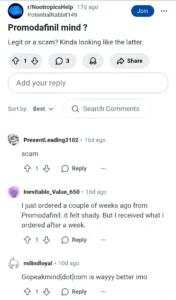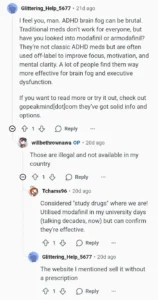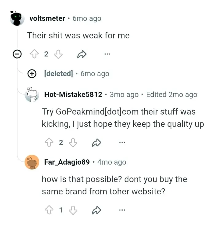 They suggest visiting this website where they could find “solid info and options.” They explain that gopeakmind.com sells these meds without a prescription. This user review seems fine, and we can take it as an indicator of Gopeakmind’s legitimacy. The second user review was posted on the same day as the first one (which is kind of suspicious). It was posted in r/nacropelsy (a condition in which your brain can’t control the sleep-wake cycle).4 They say that Gopeakmind offers lots of good options and information. Interestingly, the first user responds below and says that they also found gopeakmind.com quite helpful. They highlighted the affordability of this new platform. So, these are the two comments about this vendor that seem genuine!