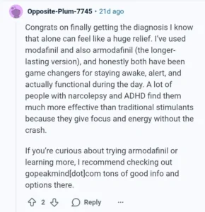 We scoured Reddit to find reliable user reviews for this newcomer to the modafinil market. But we could only find two comments that didn’t stick out like a sore thumb and actually sounded genuine. The first comment has been taken from r/adhd in which the user is responding to a person’s question, “How do you function?” They suggest modafinil or armodafinil as the go-to meds to cure one’s ADHD, recommending Gopeakmind as a credible vendor.