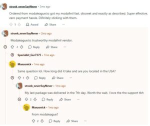 Most Reddit comments about modalegaue.to are fake and AI-generated. They seem to be bots that were given the task to propose Modaleague as a reliable nootropic vendor on Reddit. This campaign was launched two months ago. So, Modaleague’s Reddit buzz isn’t genuine. Buyers should be careful when they try to order modafinil from this vendor.