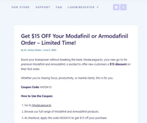 Yes, Modaleague does offer coupons for first-time buyers and repeat customers. You can use the code MODA15 to get $15 off on your modafinil and armodafinil purchases. These deals help reduce the overall cost of these meds. But keep in mind that the validity of coupons largely depends on the legitimacy of the vendor itself.
