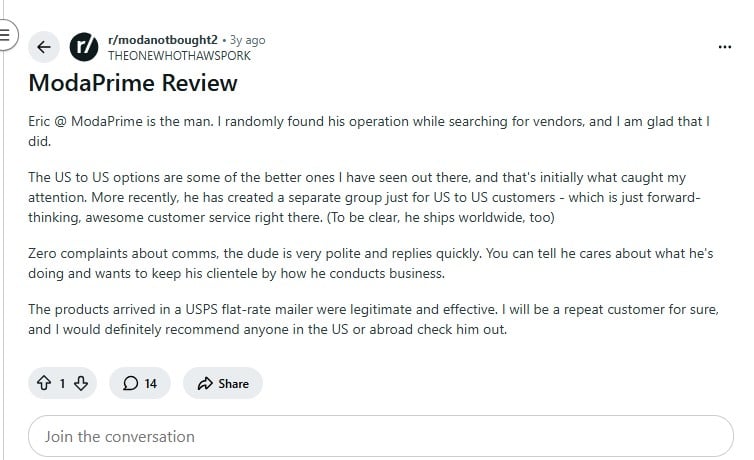 With Modaprimeusa, the pattern looks steady rather than flashy. The operation has kept the same identity from its Reddit days through to the current website, which already says a lot in a market where disappearing and reappearing under new names is common. There is no sense of a vendor constantly reinventing itself to stay ahead of complaints.